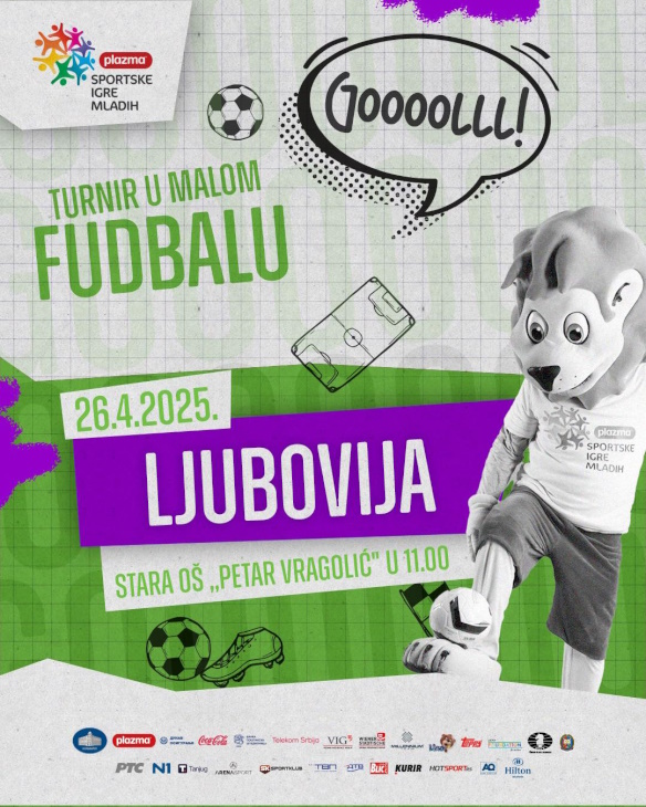 Dana 29.04.2025.godine(subota) održaće se kvalifikacioni turnir u malom fudbalu u okviru Sportskih igara mladih. Turnir se odžava na terenu za male sportove stare OŠ "Petar Vragolić" u Ljuboviji sa početkom od 11:00 časova. Pravo nastupa imaju dečaci rođeni 2014.godine i mlađi i devojčice rođene 2013.godine i mlađe. Prijave zainteresovanih ekipa od 10:30-11:00 časova na dan održavanja turnira.
